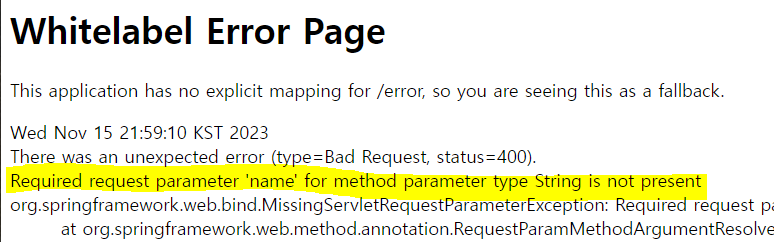위 에러 메세지에 나와있듯이, "name"이라는 이름의 @RequestParam을 안넘겨주어서 에러가 발생했다