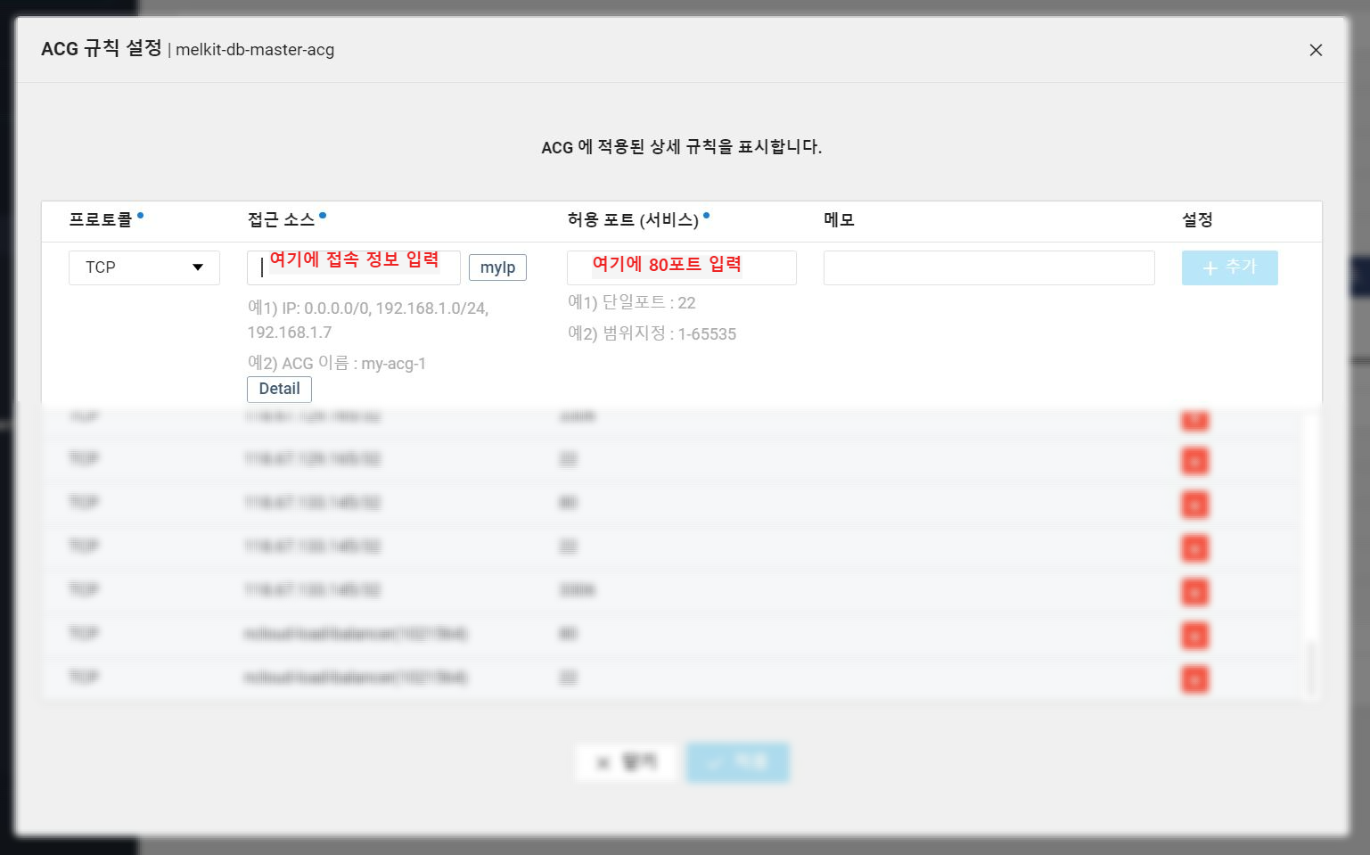 ACG설정에서 윗 사진의 접속 정보를 접근 소스에 넣습니다