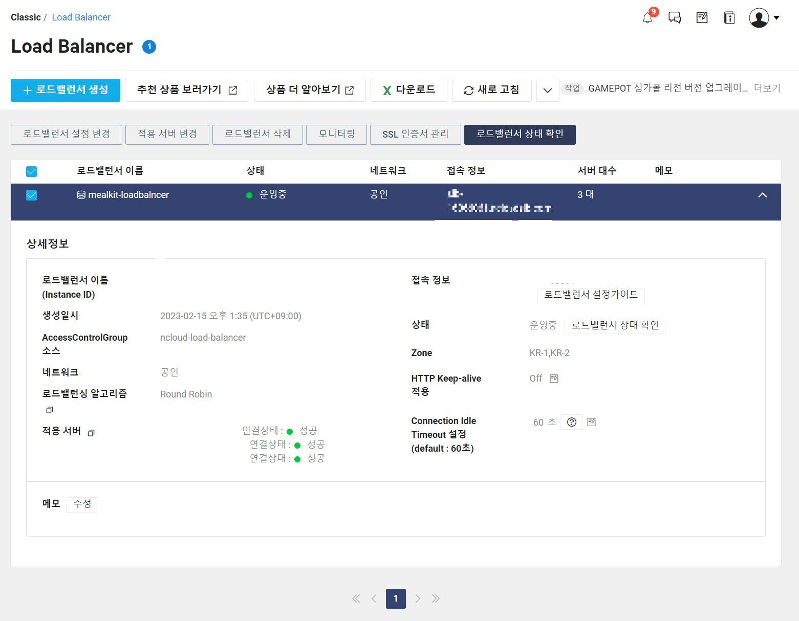 로드밸런서 목록에 다음과 같이 로드밸런서 정보가 나옵니다