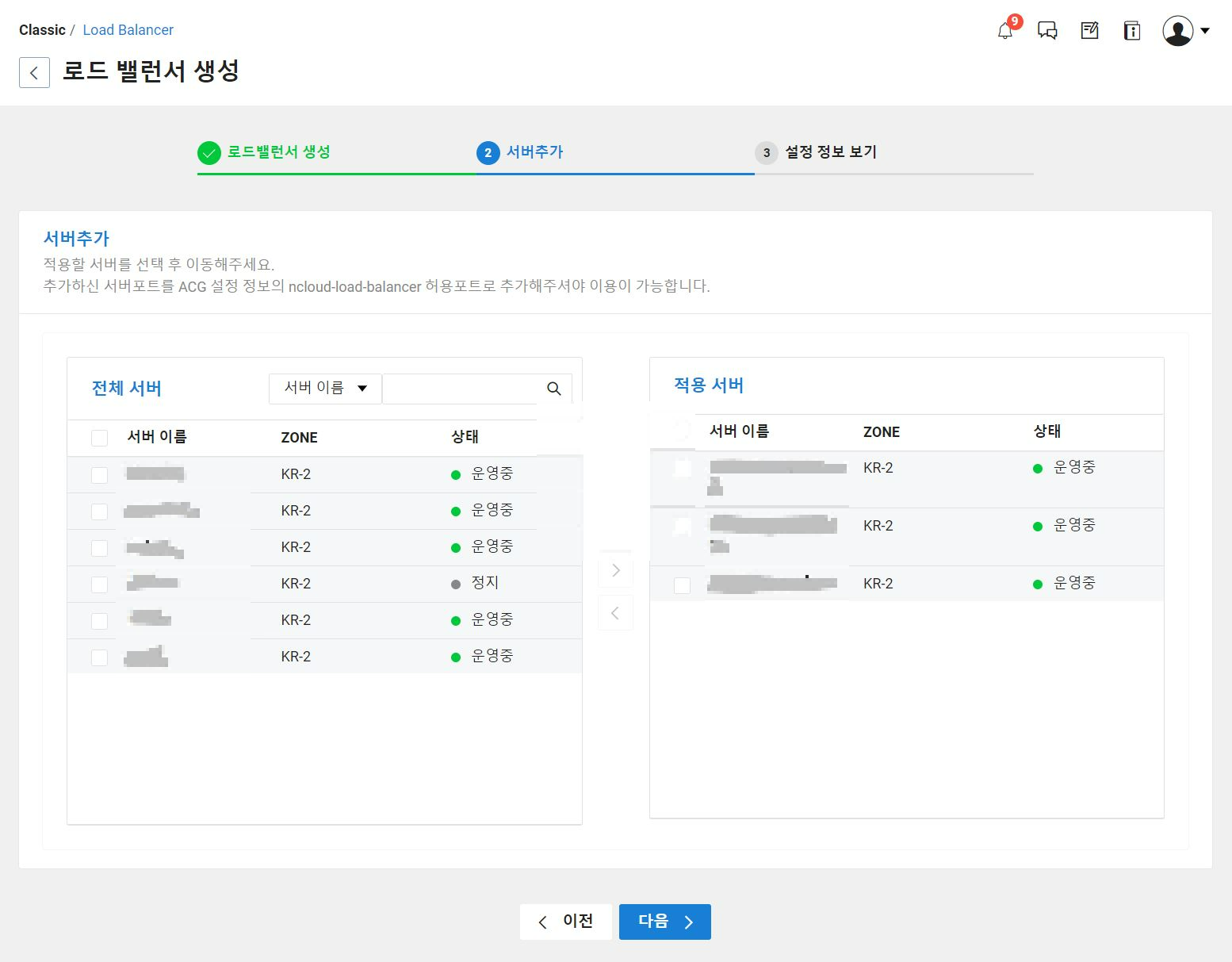 다음 버튼을 누르고 서버 목록 중 적용 서버 목록으로 원하는 서버를 선택해 옮깁니다