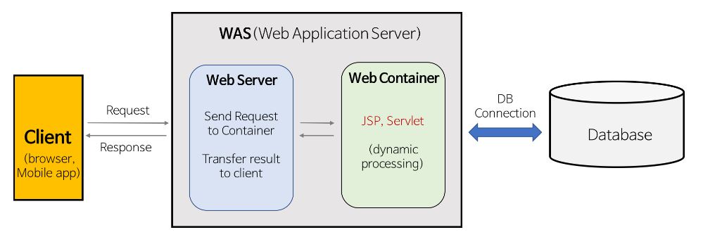 - WAS는 데이터베이스와 상호 작용하고 동적 컨텐츠를 생성하여 WS로 전달합니다
