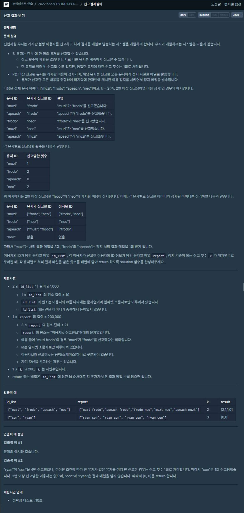- k번 이상 신고된 Id를 찾아서 정지 처리 결과 메일 발송 횟수를 배열에 저장