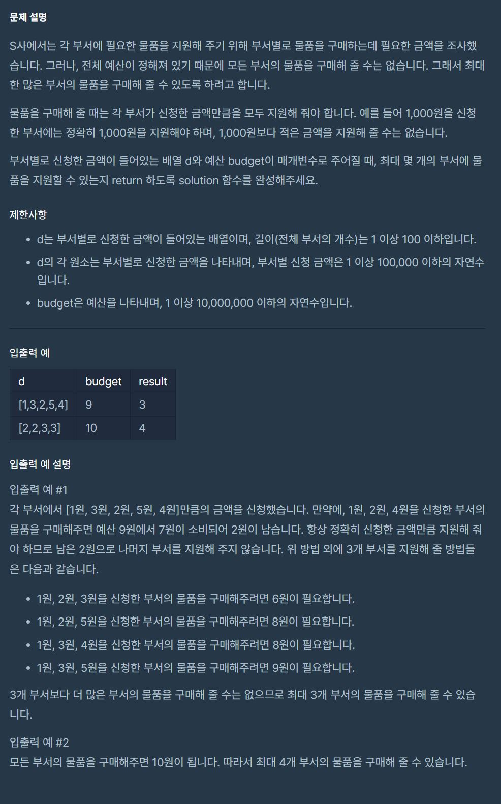 - 주어진 예산에서 d의 요소중 가장 작은 금액부터 차감