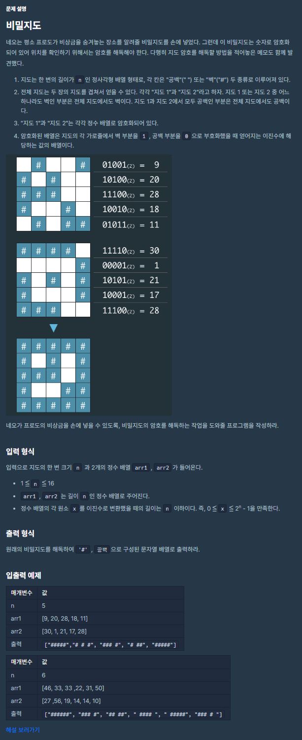 - String[] answer //두 지도를 합쳐 "#"과 " "로 이루어진 최종 지도인 문자열 배열