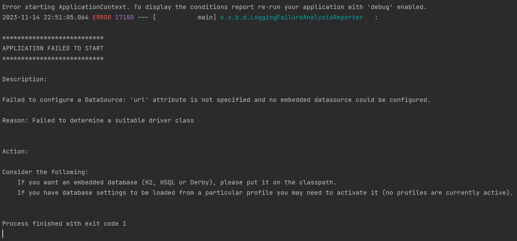 main 메서드 실행 시 에러, Failed to configure a DataSource..