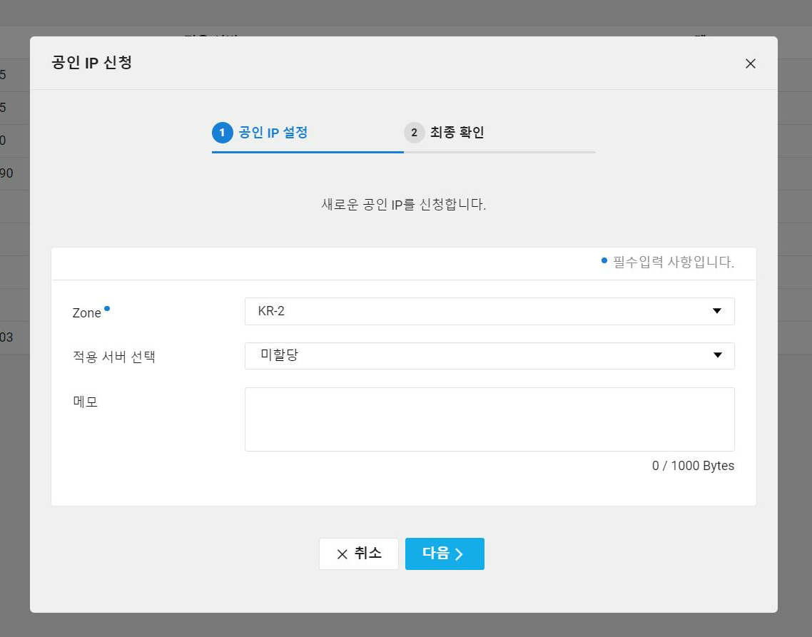 적용 서버 선택 체크박스에서 적용할 서버를 선택하고 공인 IP를 생성합니다