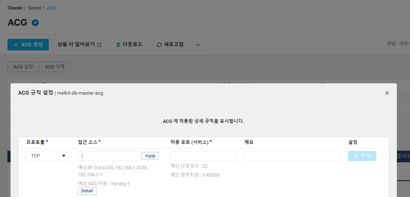저는 서버 생성시에 ACG를 기존의 melkit-db-master-acg로 하여 진행했기 때문에 이미 추가되어있는 상황입니다