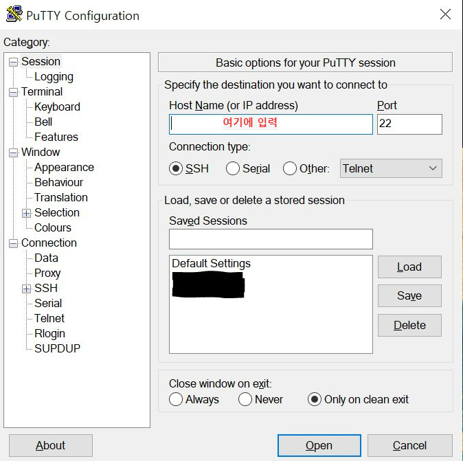 Host Name(or IP address)에 생성했던 서버의 공인 IP를 넣어줍니다